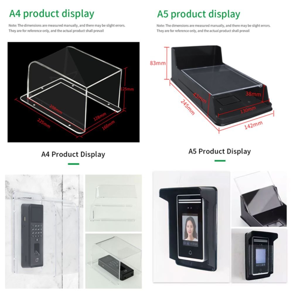 The A1/A3/A4/A5 waterproof protective cover series is designed to safeguard access control devices, face recognition terminals, biometric units, and keypads from harsh environmental conditions including rain, dust, sunlight, and accidental impact. These covers offer excellent durability, outdoor protection, and compatibility with various types of access control systems used in residential buildings, commercial offices, industrial areas, and security-sensitive locations. Each model in the A-series is built with high-quality plastic or transparent acrylic, providing long-lasting weather resistance without interfering with device functionality such as card scanning, fingerprint detection, or touchscreen operation. Their universal design allows easy installation on walls, gates, pillars, and access control stands.