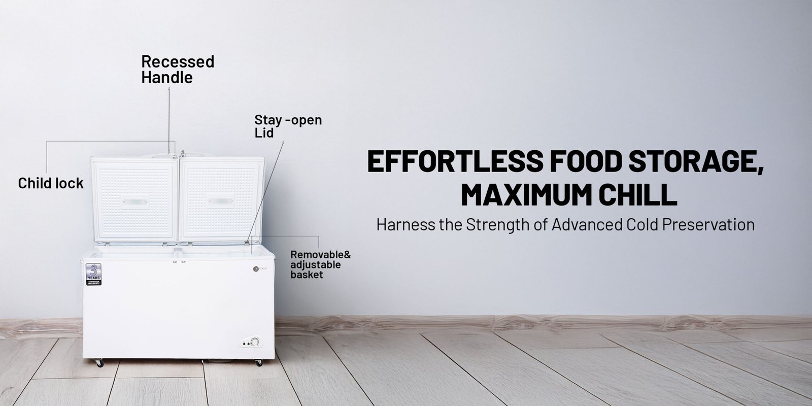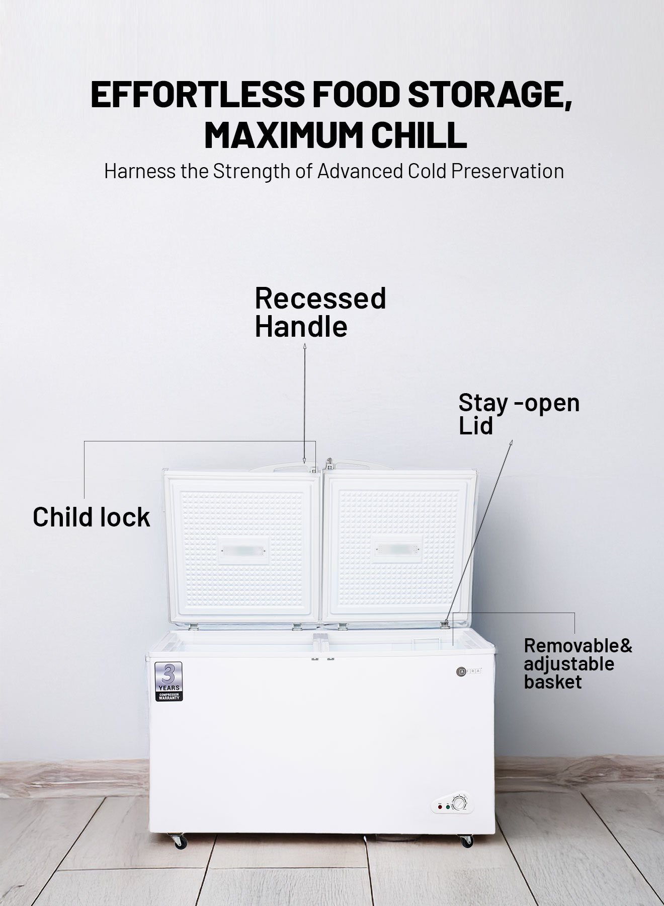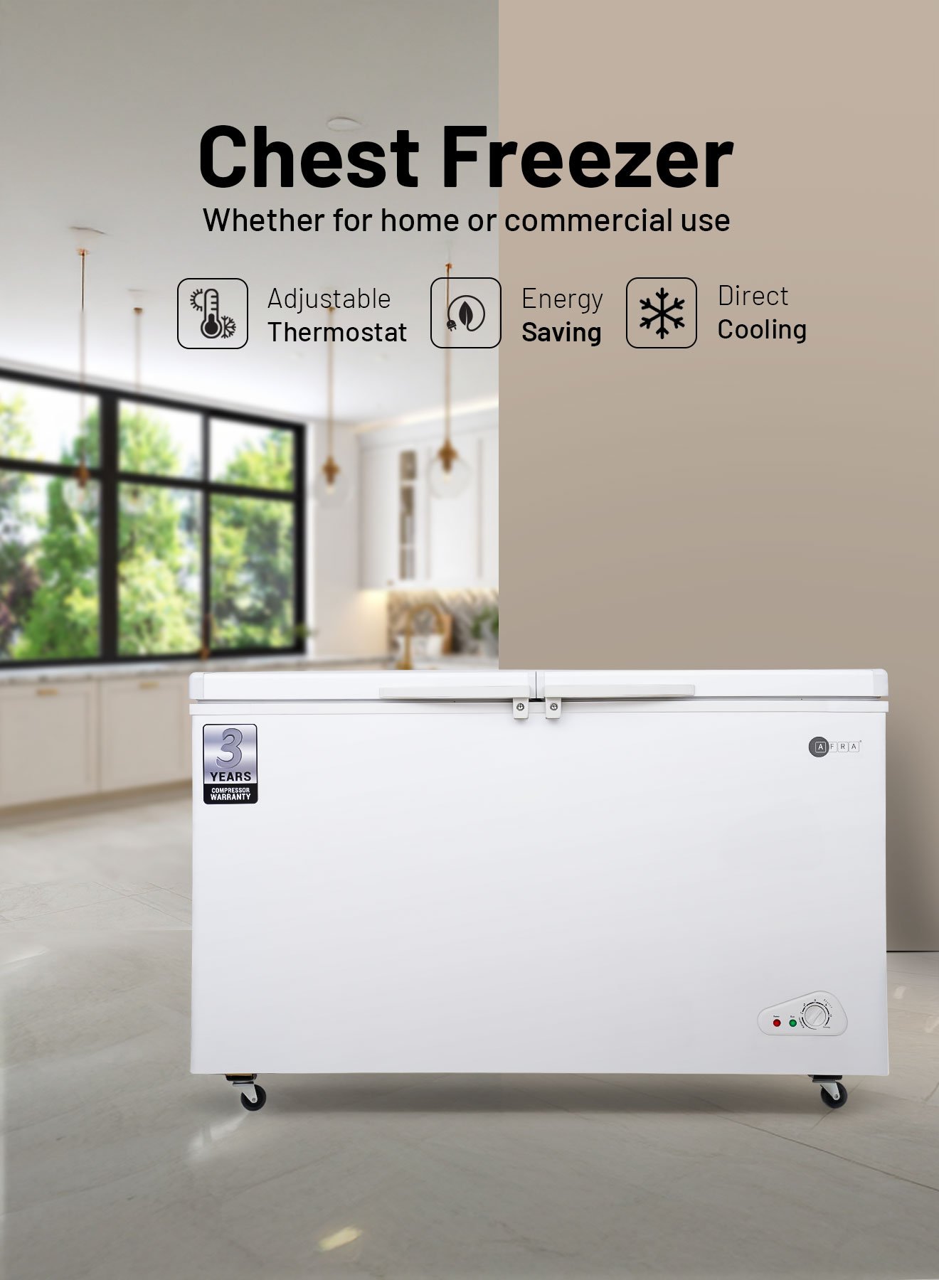 AFRA 525L chest freezer AF-5500CFWT with lock, white finish, and outside condenser for efficiency.