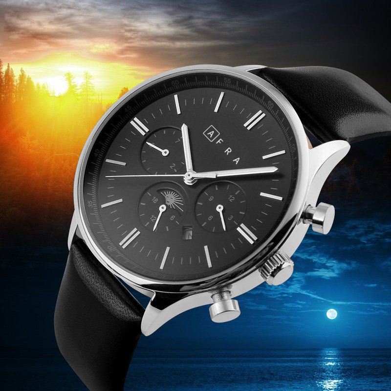 The AFRA Crescent Gents Watch | Model AF11103 is a sleek and timeless accessory for men who appreciate understated elegance. Featuring a polished silver stainless steel case, deep black dial, and a sophisticated black genuine leather strap, this watch effortlessly complements both formal and casual attire.