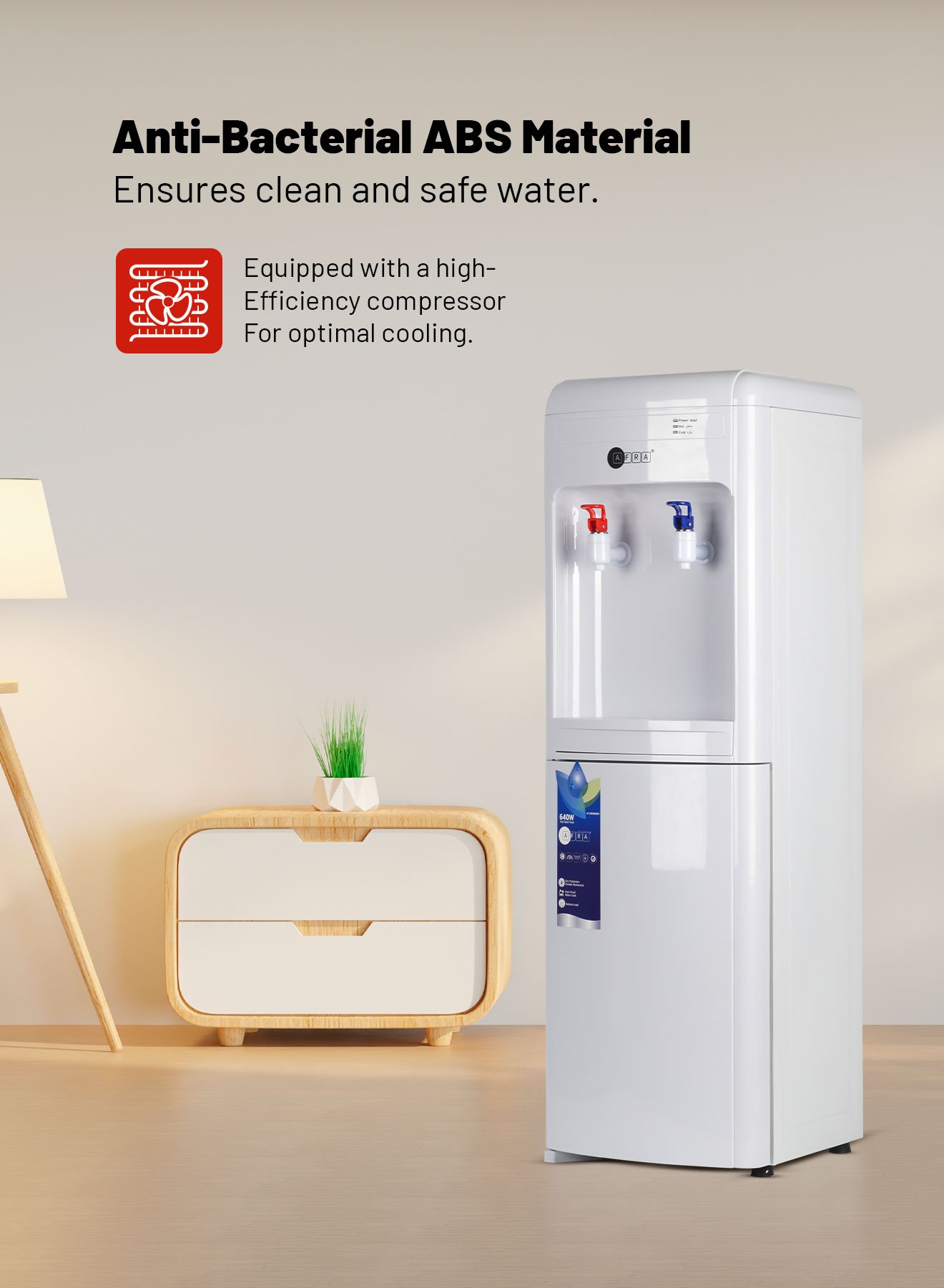 Enhance your daily hydration with the AFRA AF-9050WDWH – a stylish, functional, and efficient water dispenser for every setting.