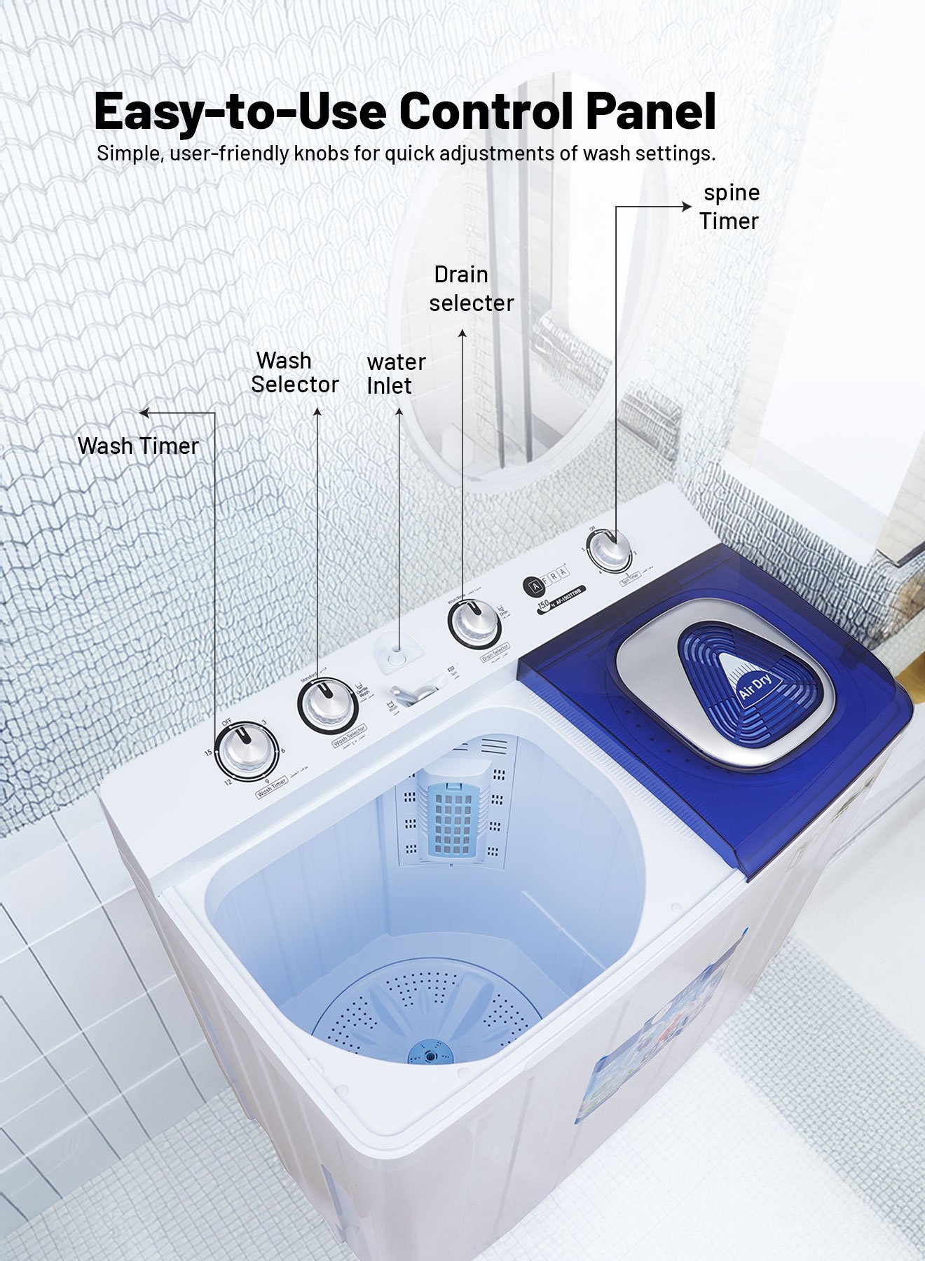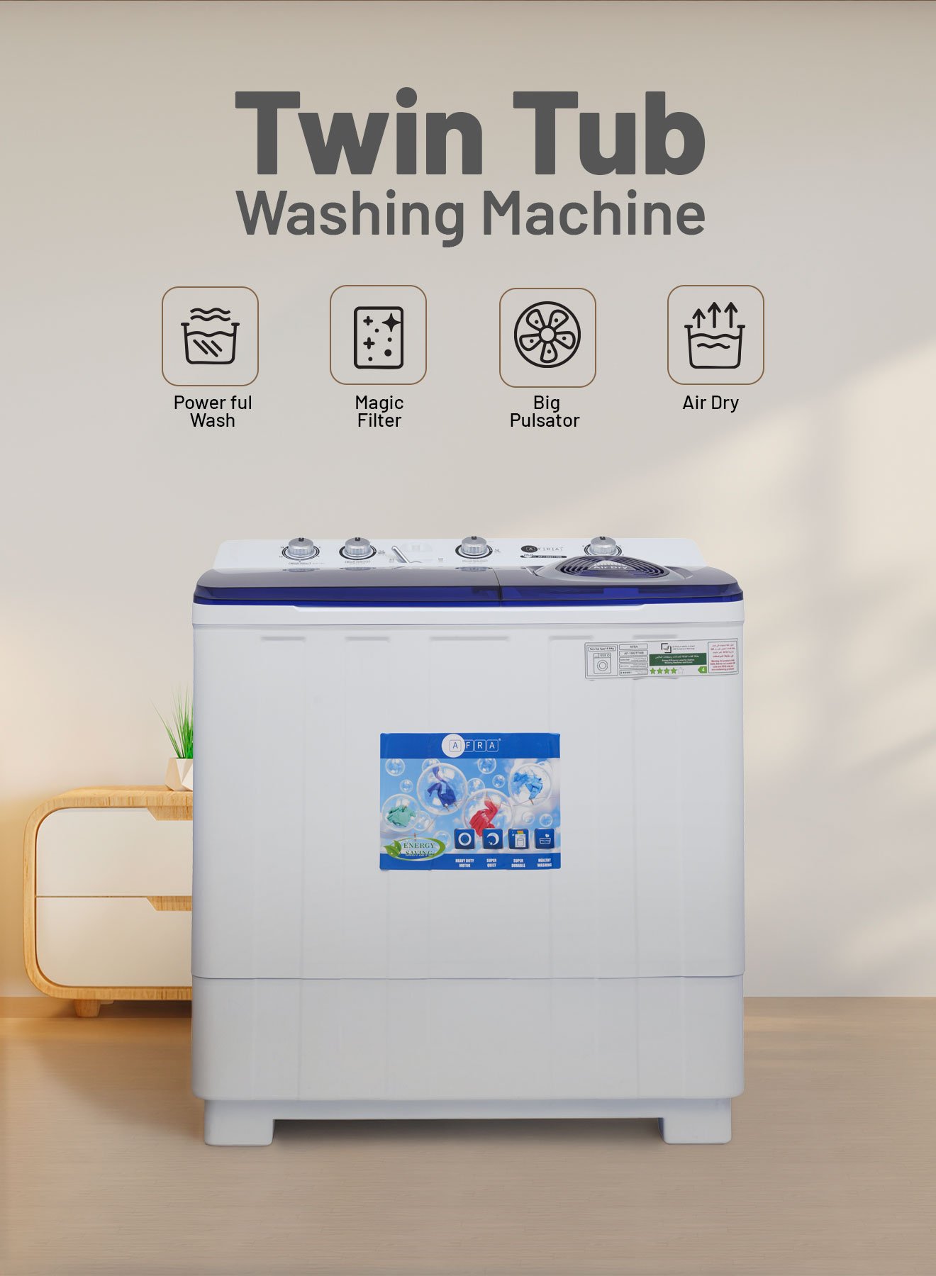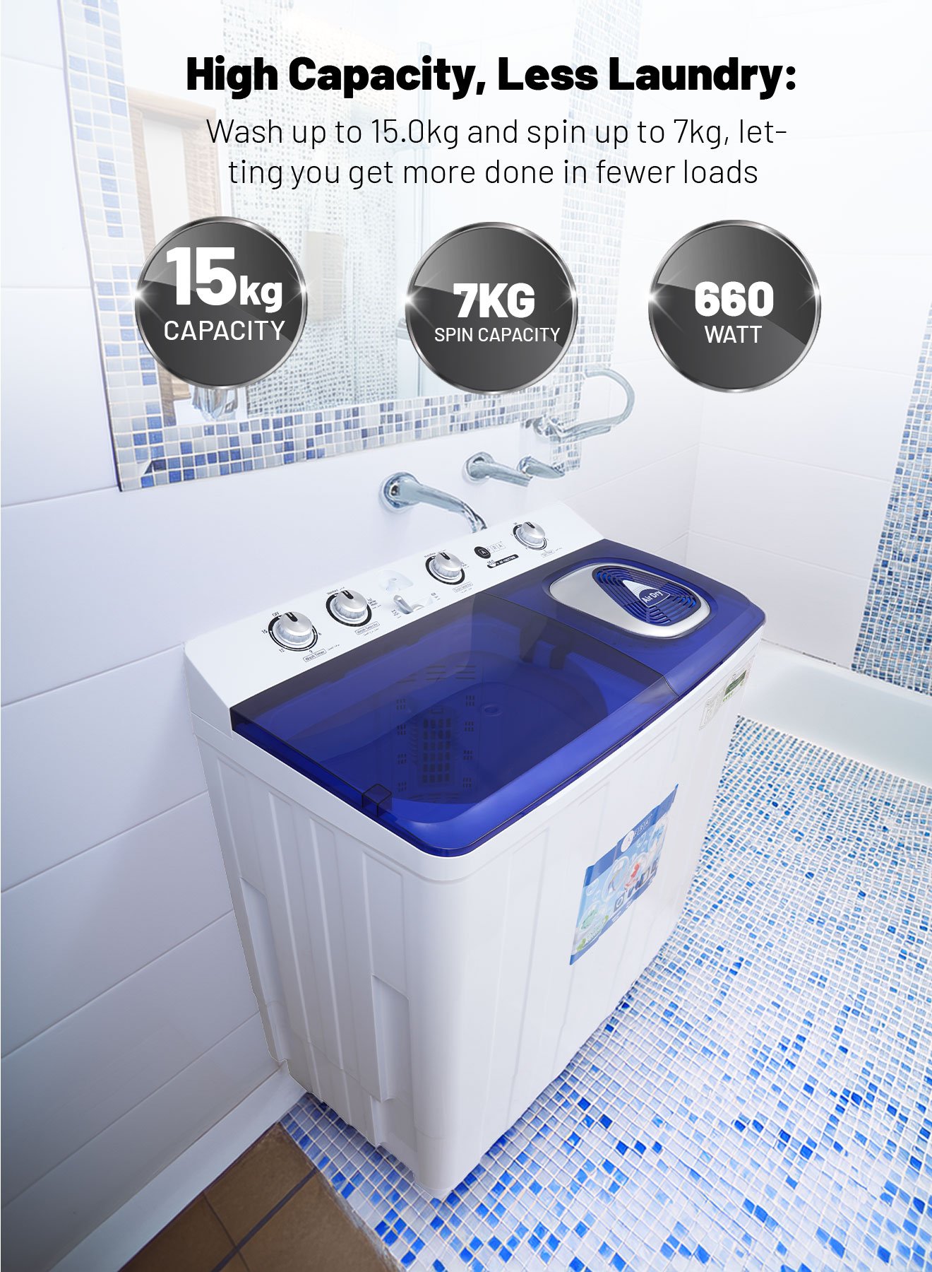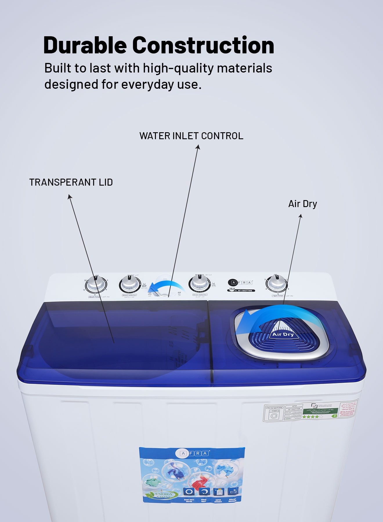 Efficient, powerful, and spacious – the AF-1502TTWB High-Capacity Twin-Tub Washing Machine is the ideal laundry solution for large households and heavy-duty laundry tasks. With a 15 kg wash capacity and 7 kg spin capacity, this washing machine is perfect for bulky loads like bedding, towels, and family-sized laundry. Powered by a 660W motor, it provides deep cleaning, even for heavily soiled garments.