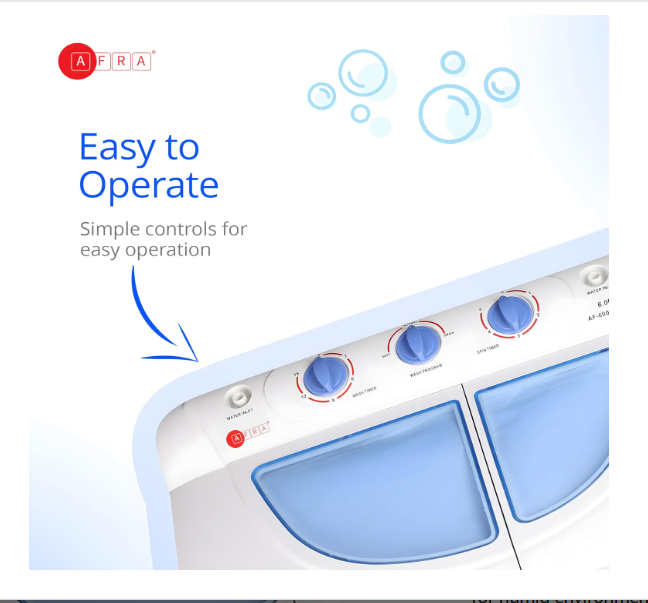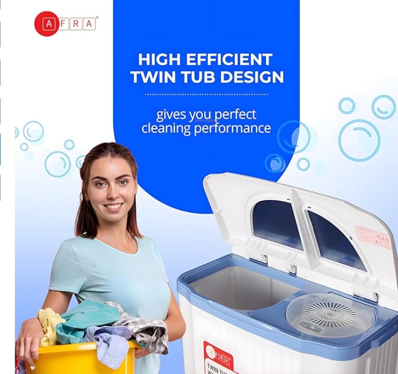 Simplify your laundry routine with the AFRA Twin Tub Washing Machine 6kg, built for durability, performance, and convenience. With a 6kg washing capacity, this washing machine is ideal for small to medium-sized families in Dubai seeking efficient and reliable laundry solutions.